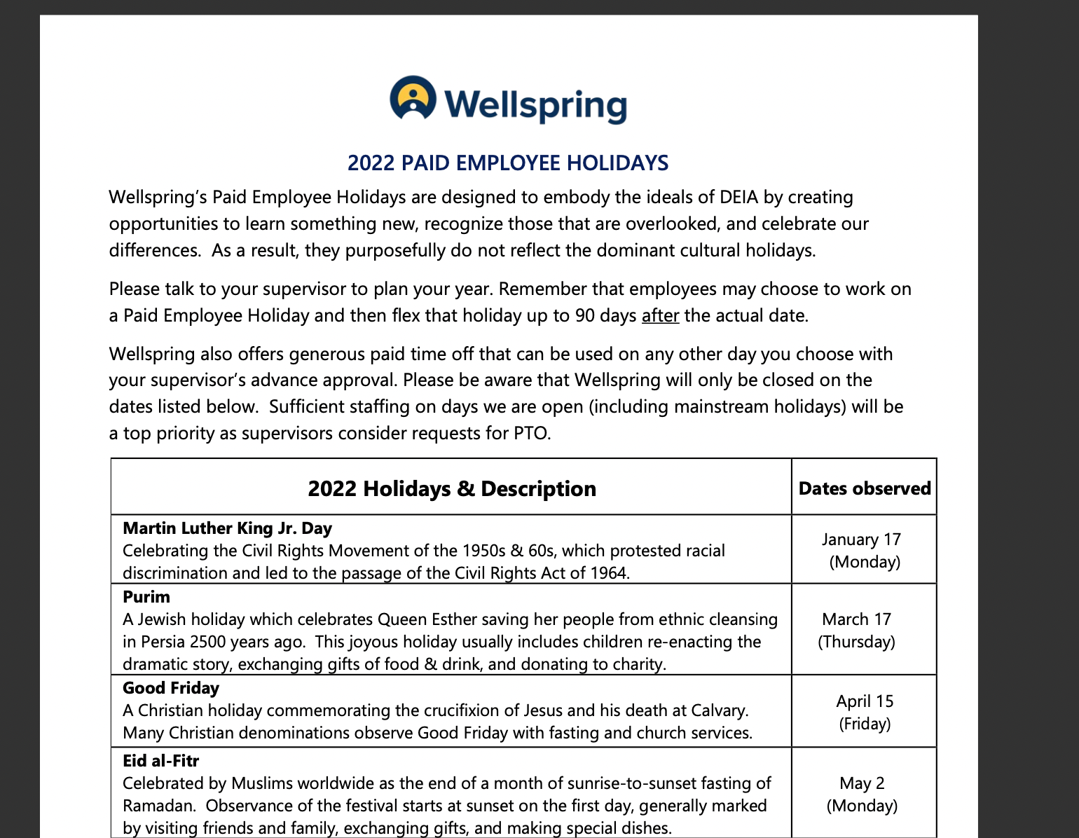 If you are thinking through universal company holidays, this is a strong example from Wellspring on how to showcase the purpose, differences and examples of the organizational paid holidays. And appreciate this list for religious and spiritual inclusion found through Better Allies on High Holidays for Major World Religions.